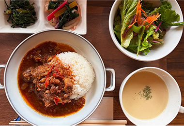 日替わりランチに町田で採れた地元の新鮮野菜を使った小鉢を添えて
